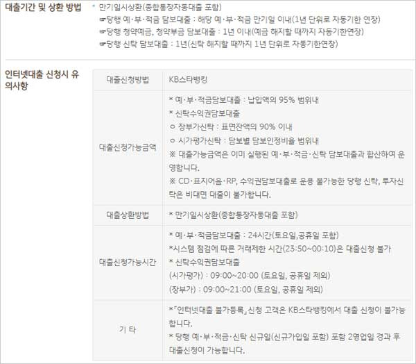 ▶ 국민은행 예금담보대출 한도 금액은 납입액의 95% 이내라고 하며 ▶ 대출 기간은 해당 예금 만기일 이내(1년 단위로 자동기한 연장)라고 합니다.