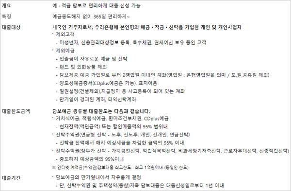 ▶ 대출 기간은 대출신청일로부터 1년 이내라고 합니다. ▶ 상환방법은 만기 일시상환방식(건별대출)/ 통장대출 형식의 한도거래대출(마이너스통장) 방식이라고 합니다. ▶ 담보는 본인명의 예적금 및 신탁수익권 담보에 자동 질권 설정을 한다고 합니다.