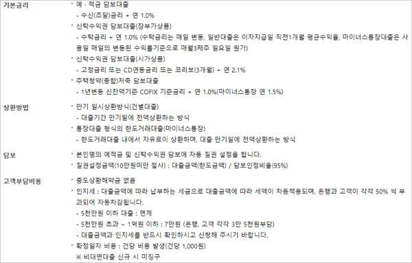 ▶ 대출 기간은 대출신청일로부터 1년 이내라고 합니다. ▶ 상환방법은 만기 일시상환방식(건별대출)/ 통장대출 형식의 한도거래대출(마이너스통장) 방식이라고 합니다. ▶ 담보는 본인명의 예적금 및 신탁수익권 담보에 자동 질권 설정을 한다고 합니다.