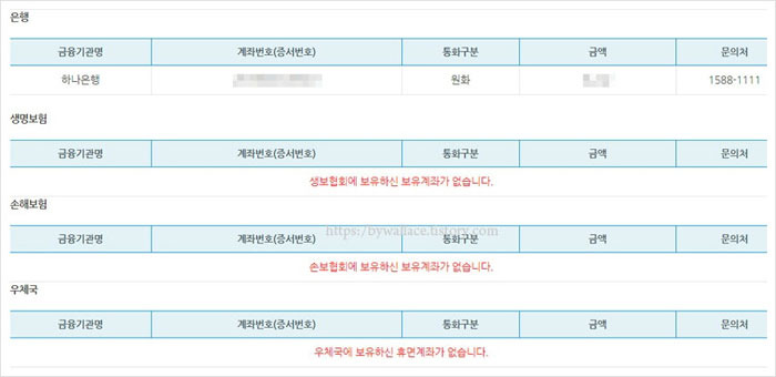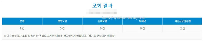 또한 아래에서 휴면계좌에 대한 자세한 정보를 볼 수 있는데요. 생명보험과 손해보험, 우체국에는 휴면계좌가 없는 것으로 확인이 되었구요. 은행에는 1건이 있는 것으로 나왔네요.