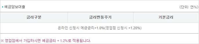 ▶대출 기간은 담보 예금 적금 부금의 만기일 이내(만기일이 없는 예금 적금 부금의 경우 취급 후 1년까지)라고 합니다. 다만 만기일이 다른 2개 이상의 예금을 담보로 한 경우 대출 기일은 최초 도래하는 예금의 만기일이라고 합니다.