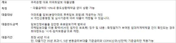 우리은행 아파트담보대출 금리 및 우리은행 아파트담보대출 한도, 서류 조건은 어떻게 될까요? 우리은행 홈페이지에서 소개하고 있는 우리은행 아파트담보대출 신청 대상 자격조건은 아파트를 담보(분양아파트 후취담보 포함)로 제공하는 개인이라고 합니다.