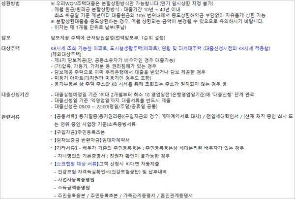 우리은행 주택담보대출 금리 이자 이율 및 우리은행 주택담보대출 한도 금액, 신청 대상 주택 자격조건, 중도상환수수료, 서류, 담보, 기간, 상환방법, 대출 유의사항 등 보다 자세한 내용은 영업점 직원 또는 우리은행 고객센터(1599-5000 또는 1588-5000)에 문의하시거나 우리은행 홈페이지 부동산 담보대출 카테고리 내 우리WON주택대출 항목을 통해 확인 할 수 있다고 합니다.