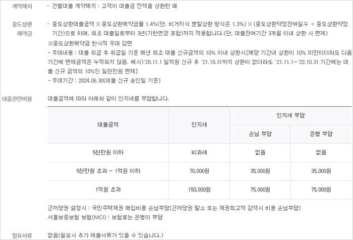 ▶ 대출 관련 비용은 근저당권 설정시 국민주택채권 매입비용은 고객 부담(근저당권 말소 또는 채권최고액 감액시 비용 고객부담)이라고 하며 서울보증보험 보험(MCI) 보험료는 은행이 부담한다고 합니다. 또한 인지세를 각 50%씩 부담한다고 합니다.