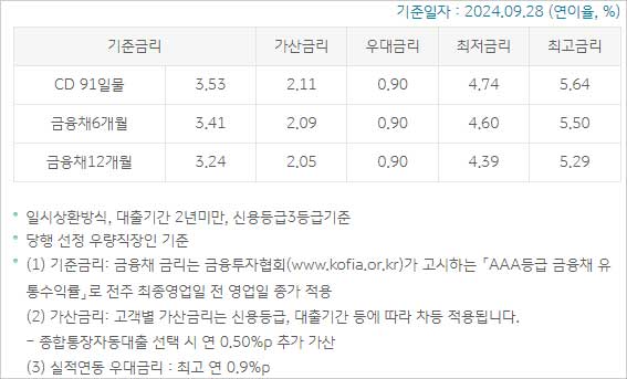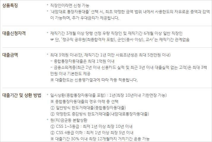 ▶ 대출 기간 및 상환방법은 일시상환(종합통장자동대출 포함)방식은 1년(최장 10년이내 기한연장 가능)이라고 하며 종합통장자동대출의 경우 아래 중 선택이 가능하다고 합니다.① 일반방식 한도거래대출(종합통장자동대출) 방식, ② 약정한도 증감방식 한도거래대출(내맘대로통장자동대출) 방식이 있다고 합니다.
