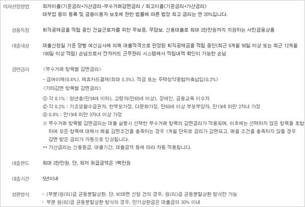 참고로 하나은행 건설근로자 대출 상품은 금리인하 요구권 및 대출계약 철회권, 위법계약 해지권 신청이 가능하며 금리 이자 이율 및 관련내용은 다음과 같다고 합니다.