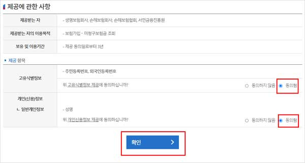 공인인증이 끝나면 개인정보 활용에 관한 동의 화면이 나타납니다. 모두 체크해야 다음 단계로 진행이 됩니다. 체크 한 후 확인을 클릭해줍니다.