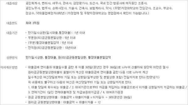 - 공인회계사, 변리사, 세무사, 관세사, 감정평가사, 도선사, 국내 민간 항공사에 재직중인 조종사, 공인노무사, 법무사, 손해사정사, 기술사, 건축사, 보험계리사, 약사, (우량)지정대학교의 전임강사, 조교수, 부교수, 정교수, 약대졸업예정자(6학년)라고 하는데요. 지정업체 및 우량지정대학교는 영업점에서 확인이 가능하다고 해요.