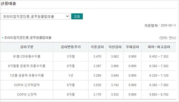 ▶ 하나은행 공무원 신용대출 금리 이자 이율은 다음과 같다고 합니다. 대출기간 1년, 하나은행 내부 신용등급 3등급인 분에게 적용하는 금리라고 합니다. 보다 자세한 금리는 홈페이지를 통해 확인할 수 있다고 합니다.