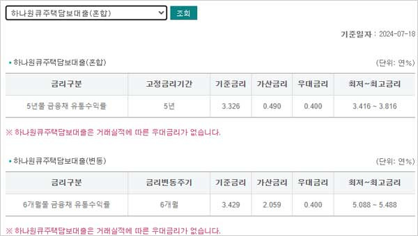 ▶ 하나은행 다세대주택 담보대출 금리 이자 이율은 다음과 같은데요. 대출기간 40년, 주택구입자금용도, 비거치식 분할상환방식, 하나은행 내부 신용등급 3등급인 고객에게 적용하는 금리라고 해요. 다만 보다 자세한 금리는 홈페이지를 통해 확인 할 수 있다고 해요.