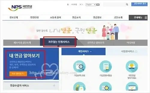 1. 국민연금 홈페이지에서 자주찾는 민원서비스를 클릭해주세요.