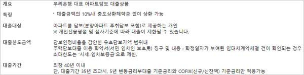 우리은행 아파트담보대출 상품은 우리은행 홈페이지에서 소개하고 있으며 우리은행 아파트담보대출 신청대상 자격조건은 아파트를 담보(분양아파트 후취담보 포함)로 제공하는 개인이 대상이 된다고 합니다..
