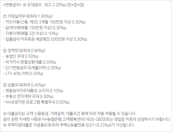 - 대출가능금액은 농협은행 및 타금융기관의 기존 대출규모에 따라 달라질 수 있다고 합니다.