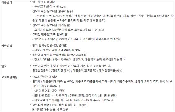▶ 상환방법은 만기 일시상환방식(건별대출)/ 통장대출 형식의 한도거래대출(마이너스통장) 방식이며 ▶ 담보는 본인명의 예적금 및 신탁수익권 담보에 자동 질권 설정을 한다고 합니다. 참고로 질권설정금액(10만원미만 절사)은 대출금액(한도금액) / 담보인정비율(95%)이라고 합니다.