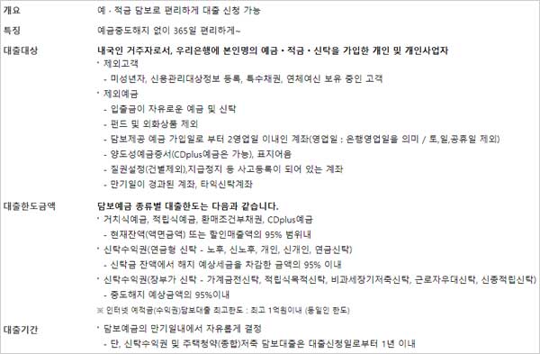 내국인 거주자로서, 우리은행에 본인명의 예금 및 적금 신탁을 가입한 개인 및 개인사업자라가 신청대상 자격조건이 된다고 합니다. 다만 미성년자, 신용관리대상정보 등록, 특수채권, 연체여신 보유 중인 고객은 대상에서 제외된다고 합니다.