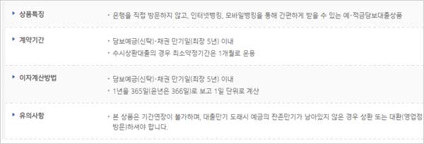 ▶ 금리인하 요구권 신청은 불가하며 ▶ 휴일 대출금 상환이 가능하다고 합니다. ▶ 기업은행 청약통장 담보대출 상품은 기간연장이 불가하며, 대출만기 도래시 상환 또는 대환(영업점 방문)해야 한다고 합니다.