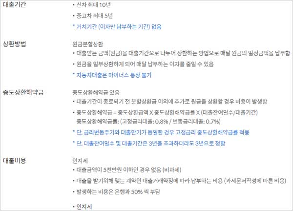 ▶ 대출 기간은 최대 5년(거치기간 없음)이라고 하며 ▶ 상환방법은 원금분할상환방식이라고 합니다. ▶ 대출관련비용으로서는 인지세가 있으며 은행과 고객이 각 50%씩 부담한다고 합니다.