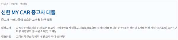 신한은행 홈페이지에서 소개하고 있으며 중고차 구매 구입 자금이 필요할때 연소득 범위 내 최대 4천만원 한도로 최대 5년 분할상환이 가능한 신한은행 중고자동차 대출 상품에 대한 신청대상 자격조건은 다음과 같다고 합니다.