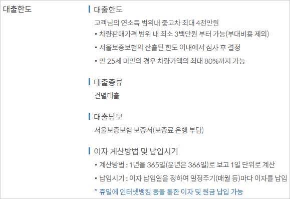 ▶ 신한은행 중고자동차 대출 한도 금액은 연소득 범위내 최대 4천만원 이내로 대출이 가능하다고 합니다. 다만 차량판매 가격범위 내 최소 취급금액은 3백만원 이상(부대비용 제외)이라고 합니다.