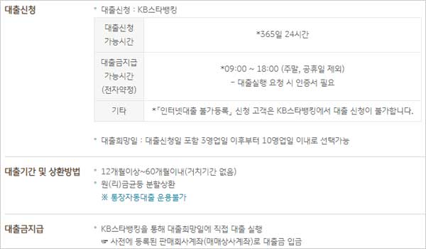 ▶ 대출금 지급은 KB스타뱅킹을 통해 대출희망일에 직접 대출을 실행하며 사전에 등록된 판매회사계좌(매매상사계좌)로 대출금이 입금된다고 합니다.