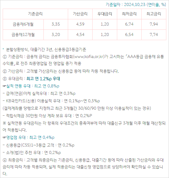 ▶ 대출 신청은 KB스타뱅킹을 통해 가능하며 ▶ 대출 기간은 12개월이상 ~60개월이내(거치기간 없음)라고 합니다. ▶ 상환방법은 원(리)금균등 분할상환방식이라고 합니다. 다만 통장자동대출은 운용이 불가하다고 합니다.