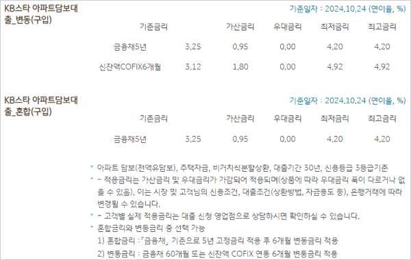 참고로 국민은행 아파트 담보대출 상품은 금리인하 요구권 신청 및 대출계약 철회권, 위법계약 해지권 신청이 가능하다고 하구요. 국민은행 아파트 담보대출 금리비교 변동금리 혼합금리 이자 이율 및 관련내용은 다음과 같다고 해요.