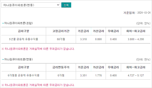 ▶ 하나은행 아파트담보대출 금리 이자 이율은 다음과 같다고 합니다.
