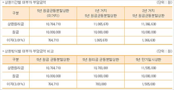 참고로 상환기간별 대부자 부담금액 및 상환방식별 대부자 부담금액은 다음과 같다고 해요.