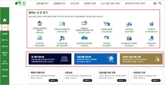파인 홈페이지에서 잠자는 내돈 찾기를 클릭하면 은행연합회 휴면예금 및 서민금융진흥원의 휴면예금 찾아줌, 생명 및 손해보험협회의 내보험 찾아줌 등 다양한 금융서비스를 한 눈에 확인 할 수 있습니다.