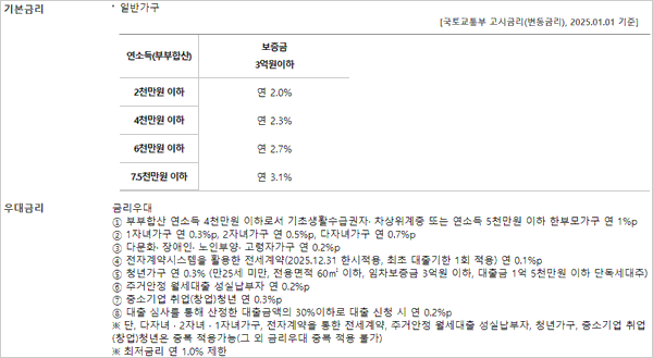 우리은행 청년 버팀목 전세자금대출 조건이자 금리 이율은 다음과 같다고 하는데요. 국토교통부 고시금리(변동금리) 2025년 1월 1일 기준 일반가구에 대한 금리라고 합니다.