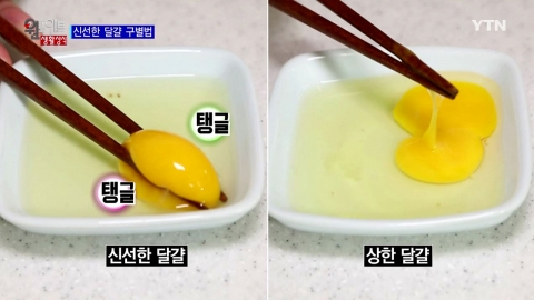 계란을 깬 다음 젓가락을 이용해 노른자를 들어올려 봅니다. 집었을 때 탱글탱글하다면 신선한 계란입니다.