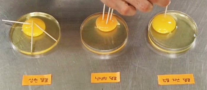 계란을 깬 다음 노른자에 이쑤시개를 꼽아본다. 이쑤시개가 쓰러지지 않는 것이 신선한 계란입니다.