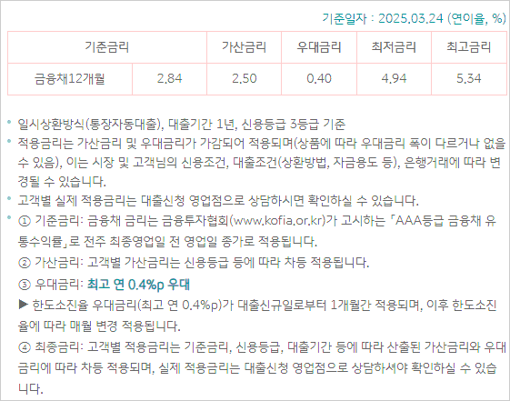 - 대출신청인이 신용도판단정보 등록자(신용회복지원 또는 배드뱅크 포함)이거나 은행의 신용평가 결과 신용등급이 낮은 고객일 경우 대출이 제한될 수 있습니다.