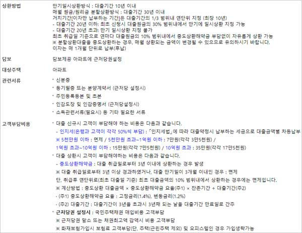 신청 대상 자격조건은 아파트를 담보(분양아파트 후취담보 포함)로 제공하는 개인이라고 합니다. 대출 한도 금액은 담보인정비율을 감안한 유효담보가액 범위 내라고 합니다.