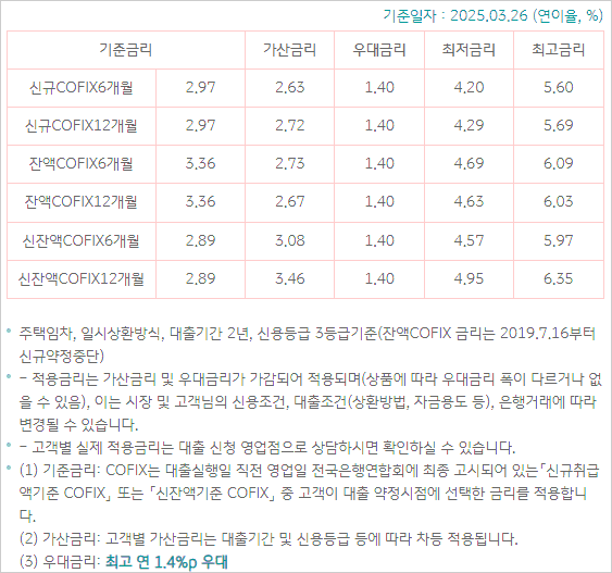 - 대출신청인이 신용도판단정보 등록자(신용회복지원 또는 배드뱅크 포함)이거나, 은행의 신용평가 결과 신용등급이 낮은 고객일 경우 대출이 제한될 수 있습니다.