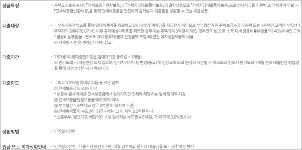 대출 기간은 25개월 이내(대출만기일은 임대차기간 종료일 + 1개월)라고 하니다. 다만 만기도래 시 자동연장이 되지 않으며, 임대차계약내용 변경(종료) 및 신용도에 따라 연장이 제한될 수 있으므로, 반드시 만기도래 1개월 전에 대출받은 영업점을 통한 사전 상담이 필요하다고 합니다.