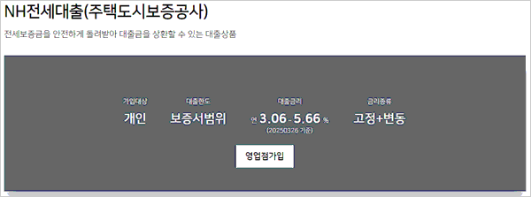 농협은행 홈페이지에서 안내하고 있는 농협 전세자금대출 상품은 주택도시보증공사 전세자금대출특약보증을 통해 전세자금을 지원받고, 전세계약 만료 시에는 전세보증금반환보증을 통해 전세보증금을 안전하게 돌려받아 대출금을 상환할 수 있는 대출상품이라고 합니다.