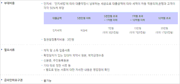 대출 관련 비용은 인지세 및 질권설정통지 수수료(30,000원)가 있다고 합니다. 기업은행 전세자금대출 서류로는 재직 및 소득 입증서류, 확정일자가 있는 임대차 계약서 원본, 계약금영수증, 신분증, 주민등록등본, 기타 따로 정한 서류 등이 피리요하며, 별도로 받는 서류에 대한 자세한 내용은 영업점 확인이 필요합니다.
