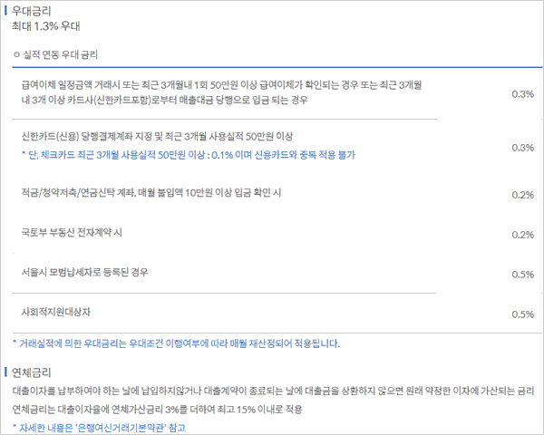 - 대출금리는 차주 신용도별 차등 적용되며, 대출 이자 미납 및 대출 만기 후 미상환시에는 여신거래 약정에서 정한 기간별 연체이율이 적용되고 신용정보관리대상 등록 등의 불이익을 받을 수 있습니다.