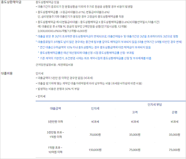 중도상환 수수료 해약금은 중도상환 수수료 해약금은 중도상환해약금 X 중도상환해약금률(고정금리대출:0.61%, 변동금리대출:0.6%) X (대출잔여일수/대출기간)방식으로 적용된다고 합니다.