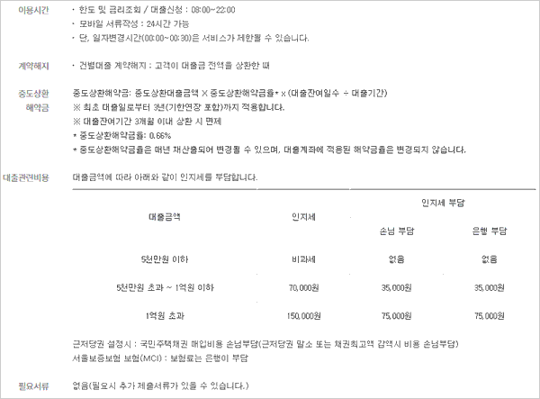 대출 관련 비용은 근저당권 설정시 국민주택채권 매입비용은 고객 부담(근저당권 말소 또는 채권최고액 감액시 비용 고객부담)이라고 하며, 서울보증보험 보험(MCI) 보험료는 은행이 부담합니다. 또한 인지세를 각 50%씩 부담한다고 합니다.