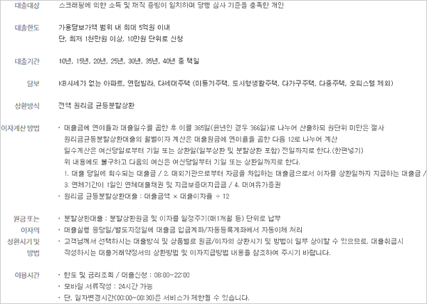 - 신용도에 따라 대출한도와 대출금리가 차등 적용되며, 투기지역여부, DSR충족 여부, 주택관련대출보유여부, 주택보유수, 담보용도 등에 따라 감독규정에 부적합하거나, 은행에서 정한 부적격자에 대하여 대출한도 및 대출취급이 제한될 수 있습니다.