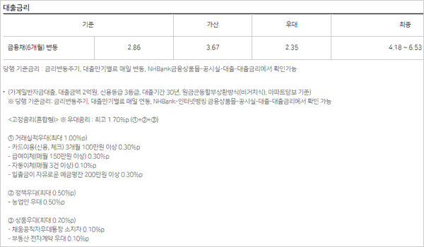 농협 주택담보대출 고정금리 변동금리 이자 이율은 다음과 같다고 하는데요. 가계일반자금대출, 대출금액 2억원, 신용등급 3등급, 대출기간 30년, 원금균등할부상환방식(비거치식), 아파트담보 기준에 따른 금리라고 합니다.