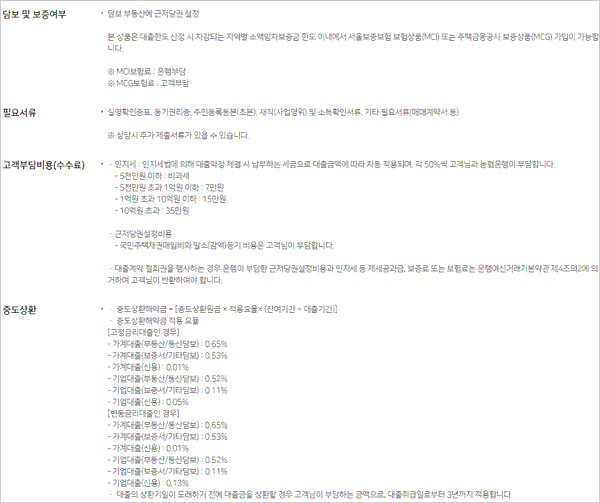 담보는 담보 부동산에 근저당권을 설정합니다. 참고로 농협 주택담보대출 상품은 대출한도 산정 시 차감되는 지역별 소액임차보증금 한도 이내에서 서울보증보험 보험상품(MCI) 또는 주택금융공사 보증상품(MCG) 가입이 가능하다고 합니다. MCI보험료는 은행부담, MCG보험료는 고객부담이라고 합니다.