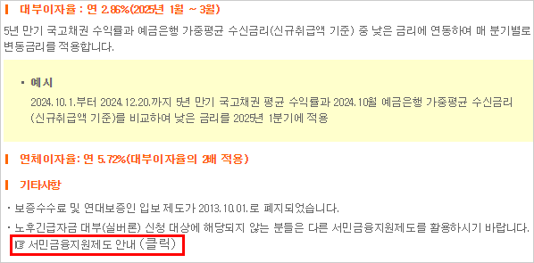 2024.10.1.부터 2024.12.20.까지 5년 만기 국고채권 평균 수익률과 2024년 10월 예금은행 가중평균 수신금리(신규취급액 기준)을 비교하여 낮은 금리를 2025년 1분기에 적용한다고 해요. 참고로 연체 이자율은 연 5.72%로 대부이자율의 2배가 적용된다고 해요.