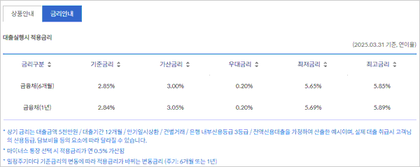 - 대출금리는 차주 신용도별 차등 적용되며 대출 이자 미납 및 대출 만기 후 미상환시에는 여신거래 약정에서 정한 기간별 연체이율이 적용되고 신용정보관리대상 등록 등의 불이익을 받을 수 있다고 합니다.