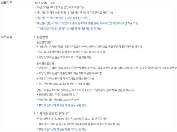 대출 기간은 10년 6개월~30년이라고 합니다. 10년 6개월 부터는 월 또는 연단위로 지정이 가능하며, 참고로 거치기간은 최대 10년 범위 내 대출기간의 1/3까지 월단위로 지정 가능하다고 합니다.
