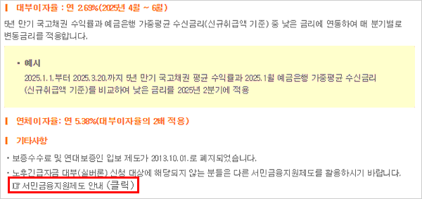 2025.1.1.부터 2025.3.20.까지 5년 만기 국고채권 평균 수익률과 2025년 1월 예금은행 가중평균 수신금리(신규취급액 기준)을 비교하여 낮은 금리를 2025년 2분기에 적용한다고 합니다. 참고로 연체 이자율은 연 5.38%로 대부이자율의 2배가 적용된다고 합니다.