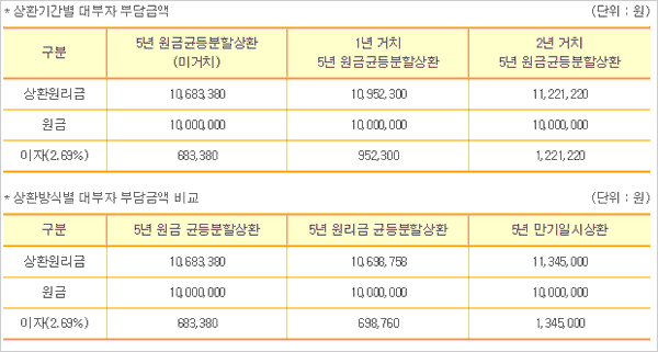참고로 상환기간별 대부자 부담금액 및 상환방식별 대부자 부담금액은 다음과 같습니다.