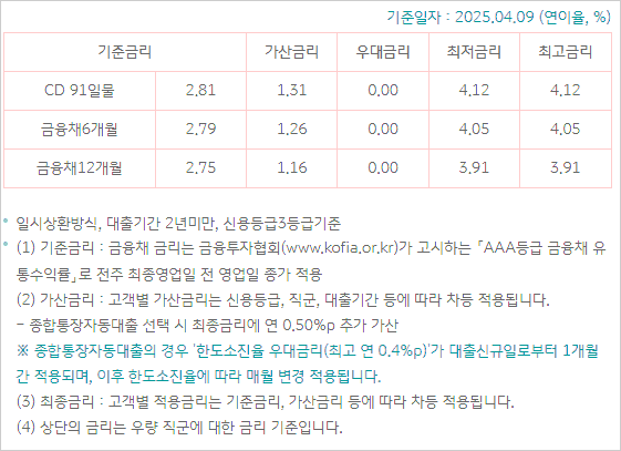 - 대출신청인이 신용도판단정보 등록자(신용회복지원 또는 배드뱅크 포함)이거나 은행의 신용평가 결과 신용등급이 낮은 고객일 경우 대출이 제한될 수 있습니다.